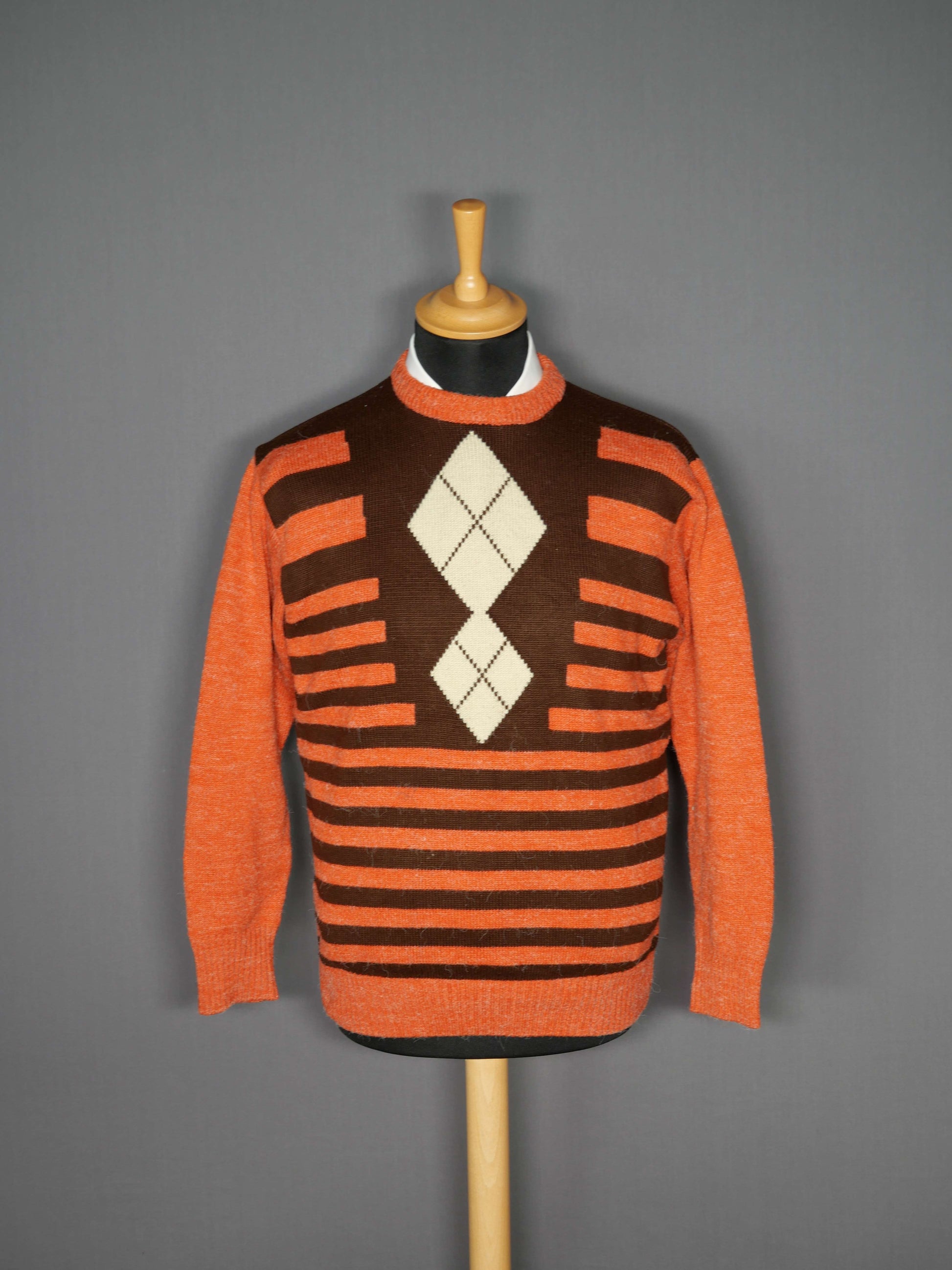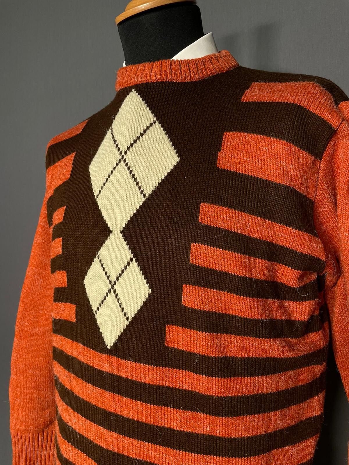 Vintage Pullover Muster orange-braun Zustand: Gut / Gebraucht Material: 100% Wolle Grösse: S Rücken: 46 cm Brust: 124 cm Schulter: 45 cm |