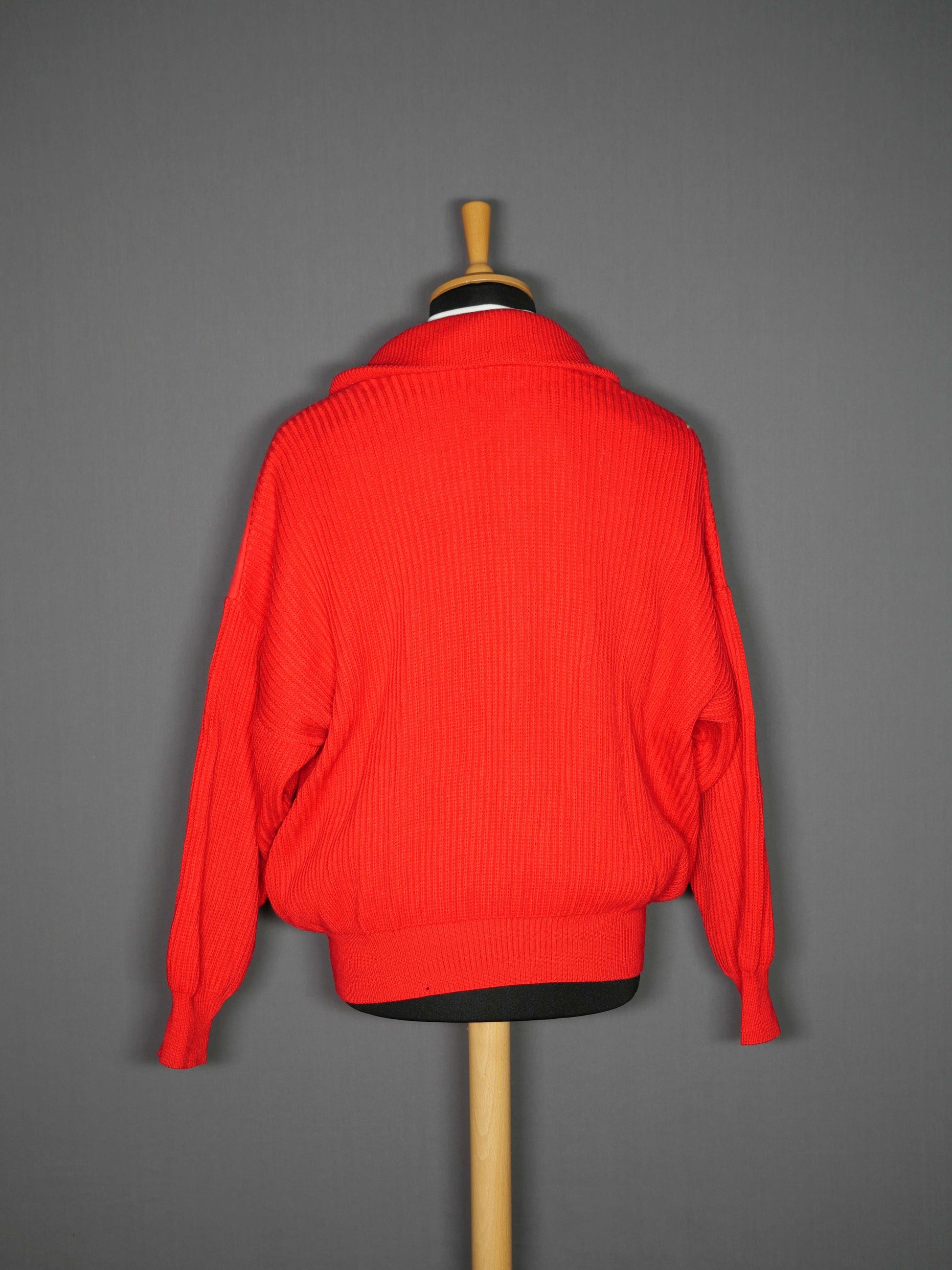 Vintage Pullover rot weit Geschnitten mit Fronttasche Gebrauchsspuren / Kleine Löcher an Kragen Material: 100% Wolle Grösse: L Rücken: 62 cm Brust: 128 cm Schulter: 74 cm |